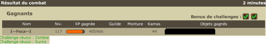![]() /w *--killart-- Serveur : Raval Inscrit le 14/07/2008 Hors ligne | Suite a la derniere mise a jour de Dofus, j'ai testé les challanges dans un donjon bouftou... le B.r était lvl 41 et je ne suis qu'a 171 de sagesse a vous de voir...![]() | |